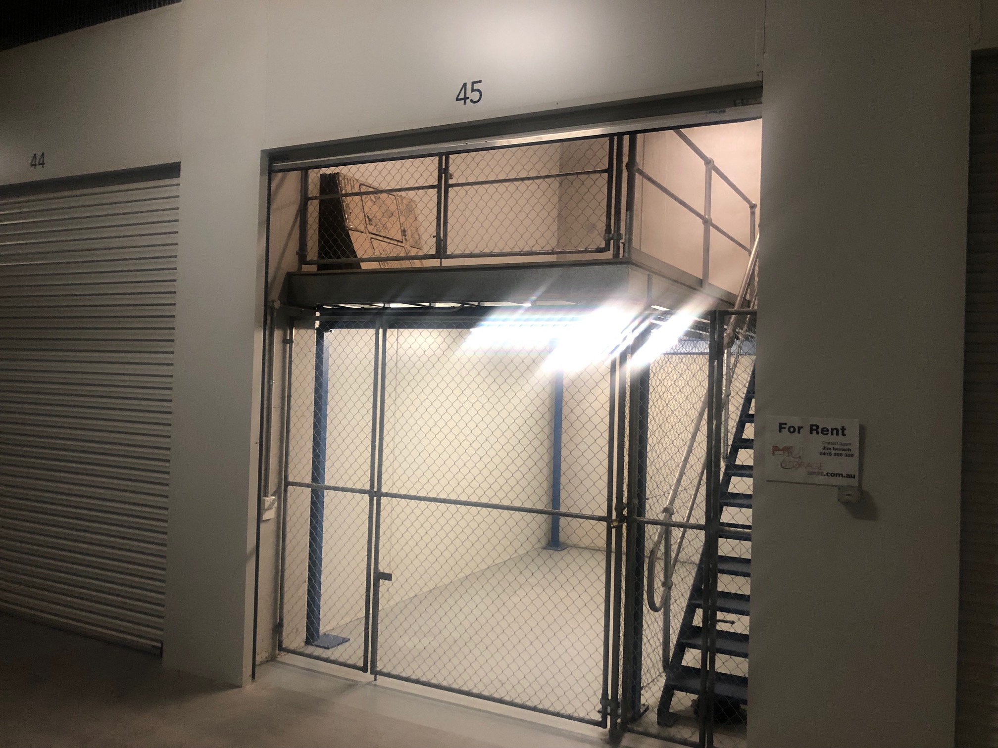 Storage unit with mezzanine floor. Plenty of light and power points.