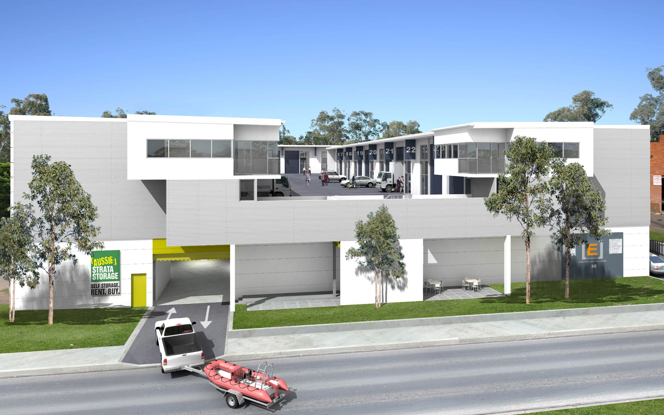 High clearance storage unit with mezzanine floor. Good access for boat or trailer. Power and phone available.